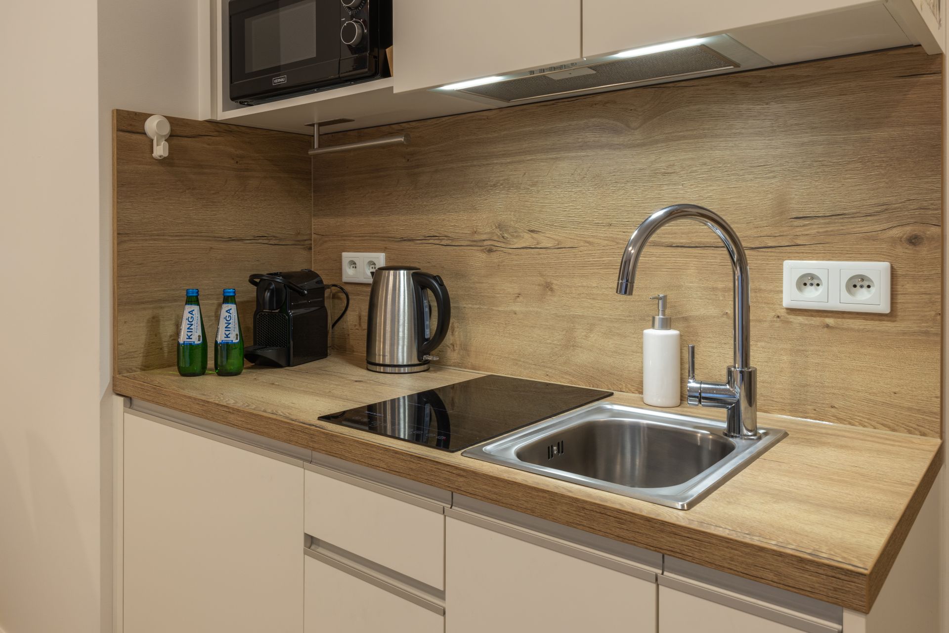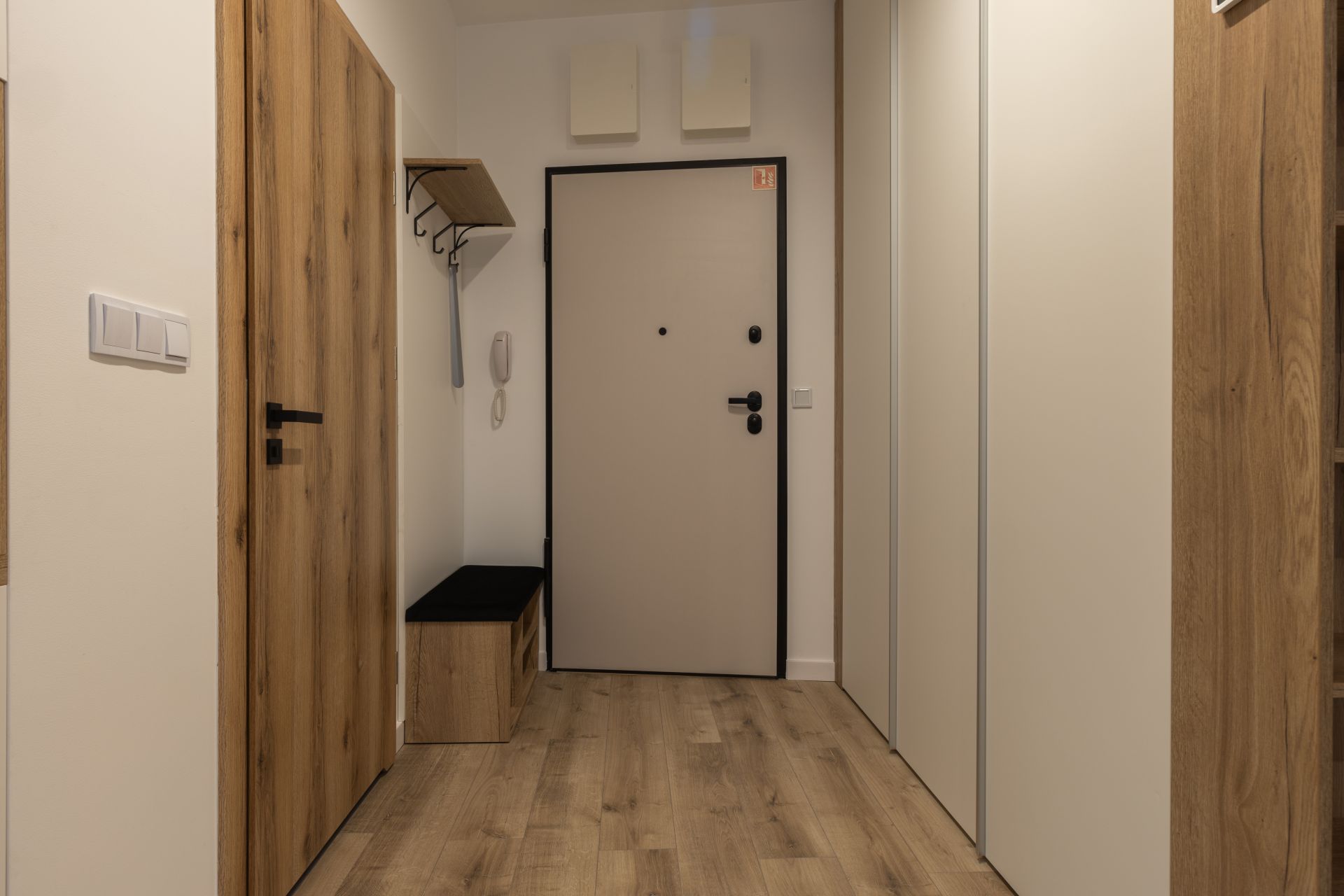 Apartament charakteryzuje się nowoczesnym wystrojem, łączącym elegancką prostotę z ciepłem naturalnych materiałów.