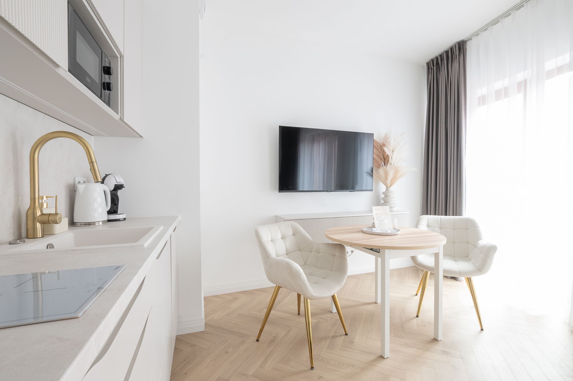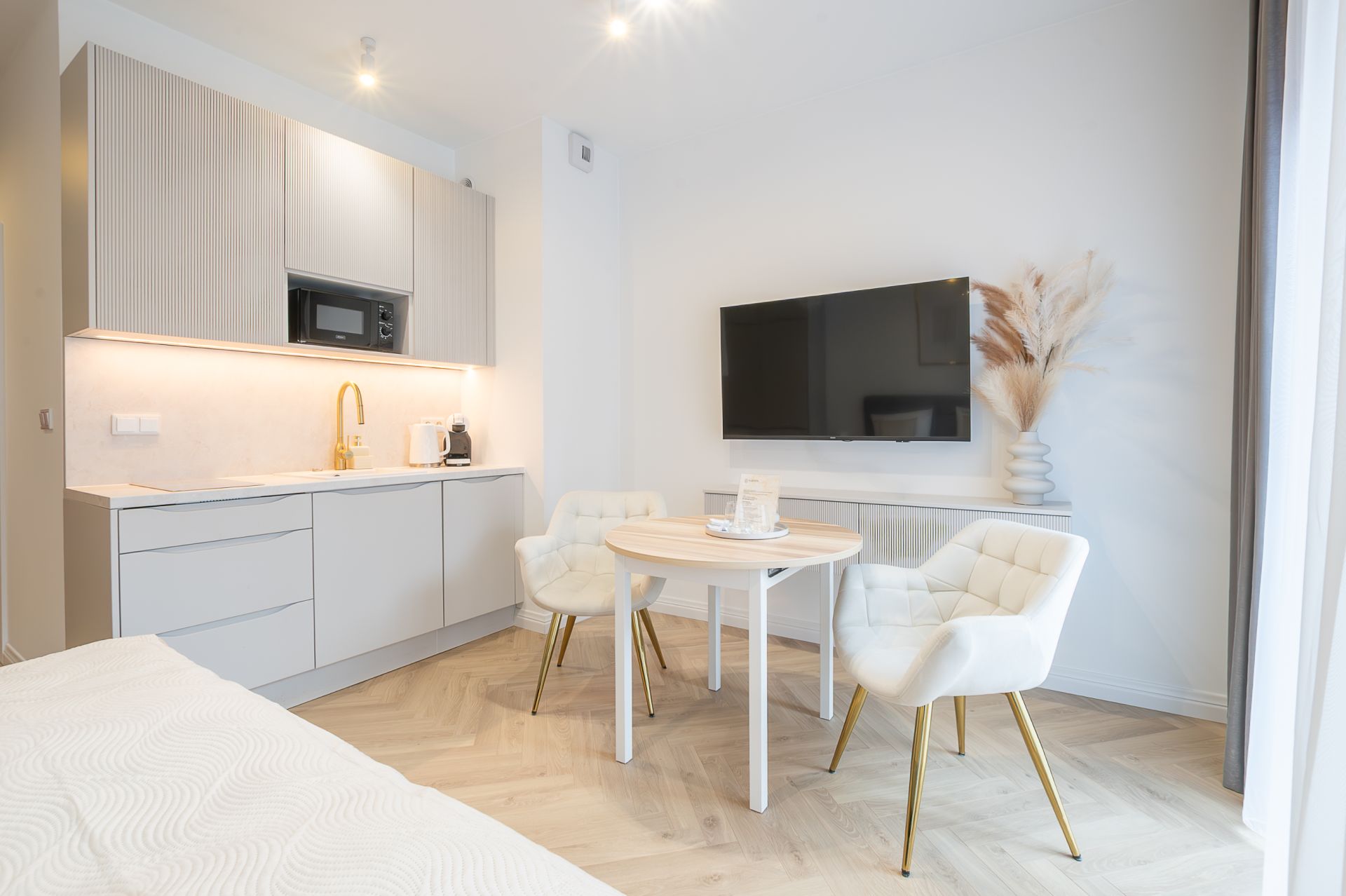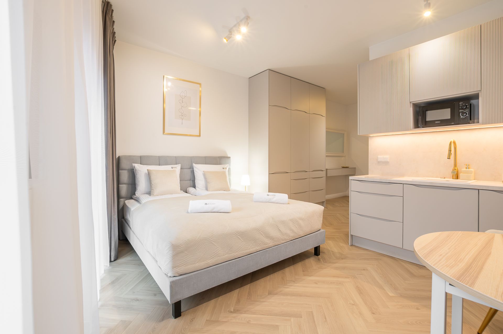 Studio zostało zaprojektowane z dbałością o detale – przestrzeń jest jasna, funkcjonalna i komfortowa. Do dyspozycji gości znajduje się wygodne łóżko małżeńskie, część wypoczynkowa z telewizorem, w pełni wyposażony aneks kuchenny oraz elegancka łazienka z prysznicem. Apartament idealny dla pary, osoby podróżującej służbowo lub solo turysty.