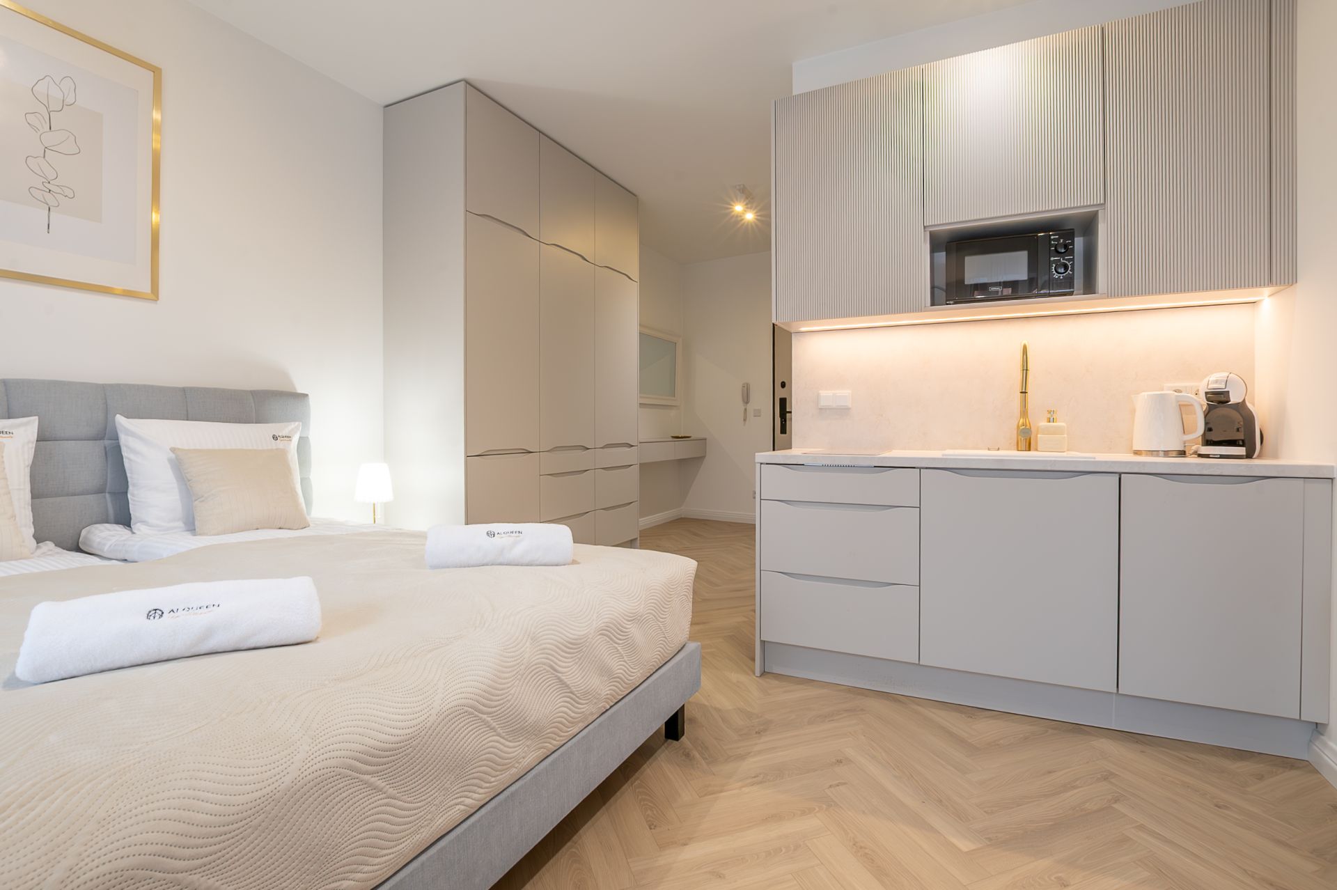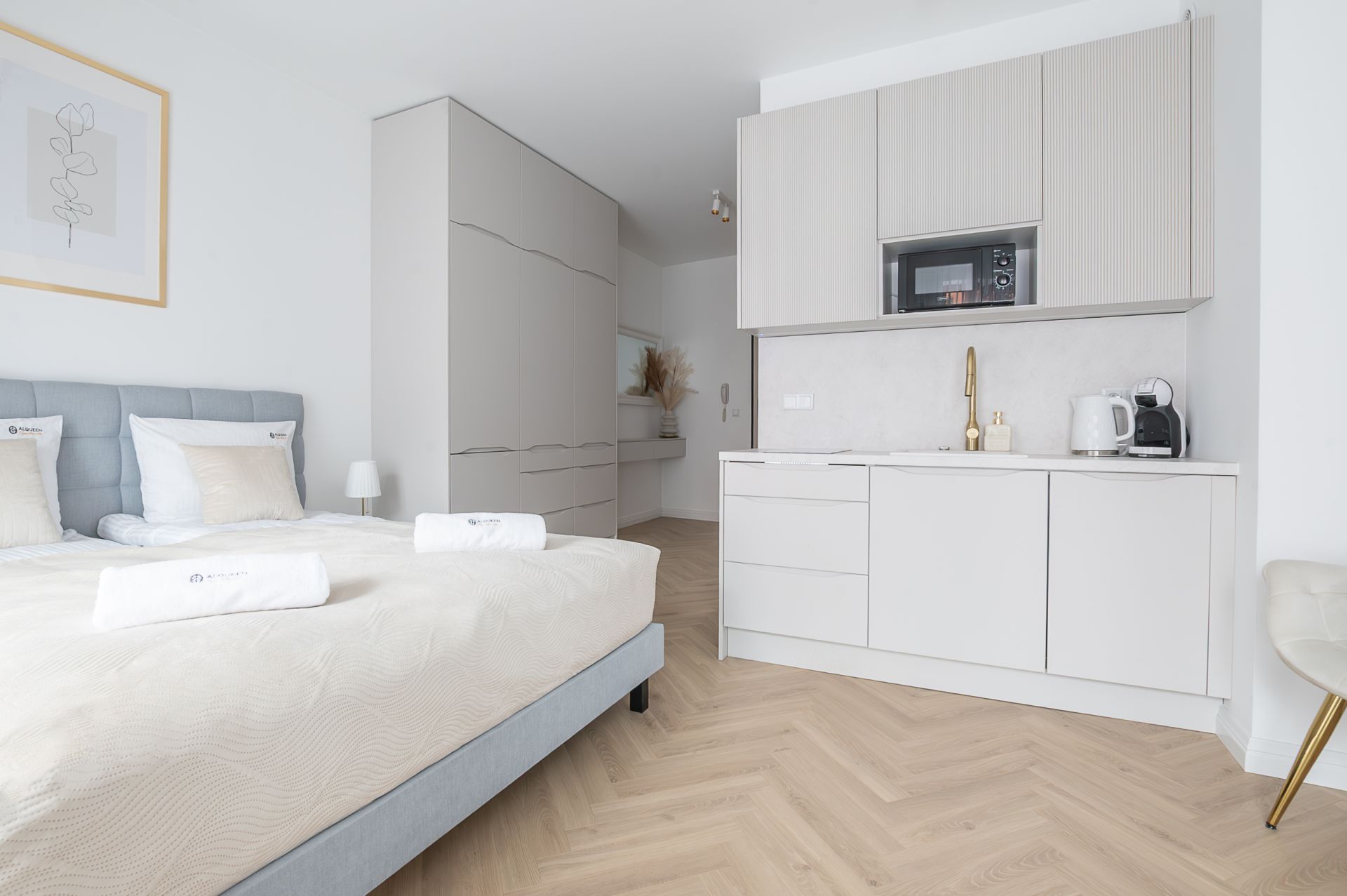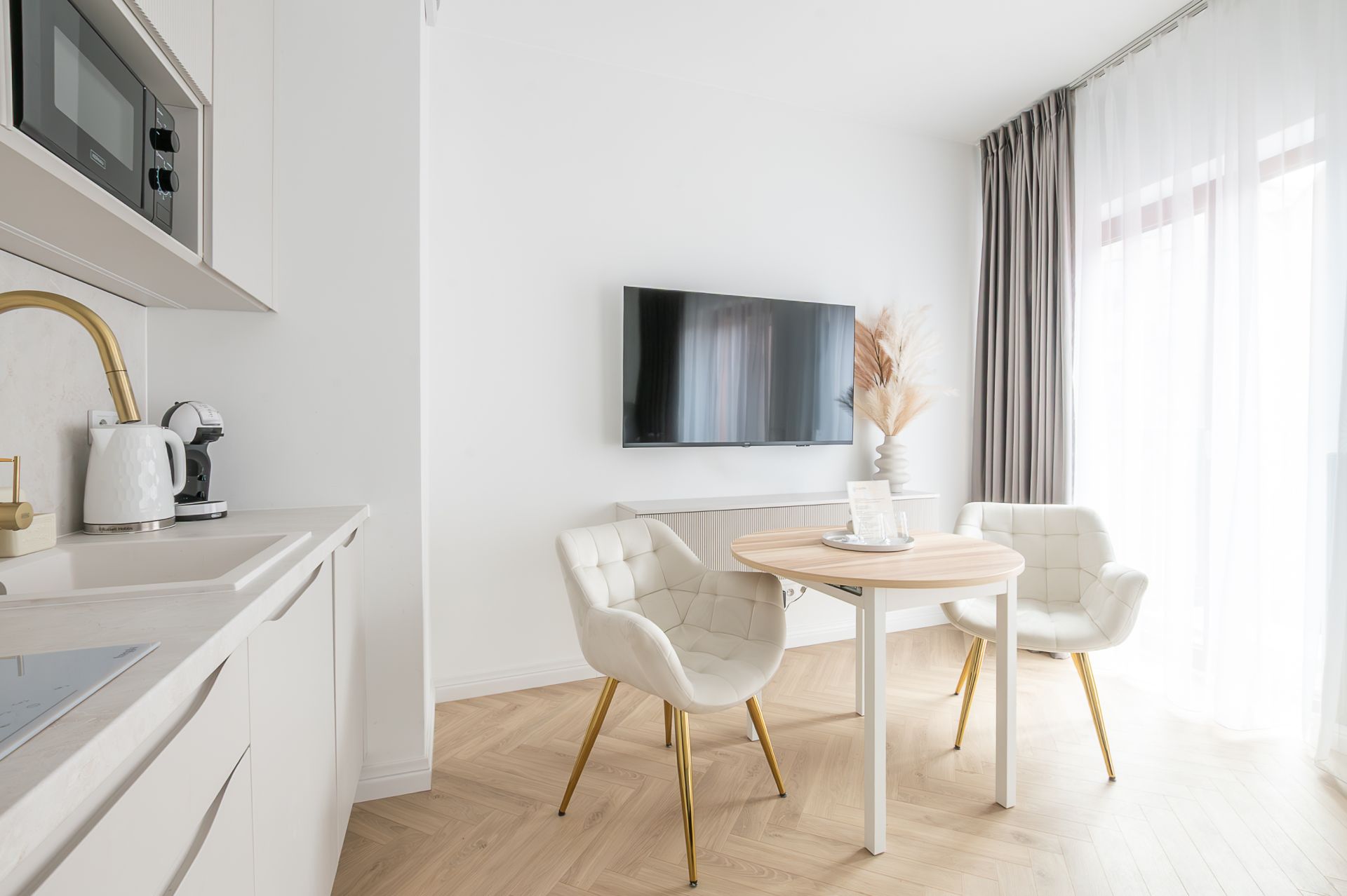 Studio zostało zaprojektowane z dbałością o detale – przestrzeń jest jasna, funkcjonalna i komfortowa. Do dyspozycji gości znajduje się wygodne łóżko małżeńskie, część wypoczynkowa z telewizorem, w pełni wyposażony aneks kuchenny oraz elegancka łazienka z prysznicem. Apartament idealny dla pary, osoby podróżującej służbowo lub solo turysty.