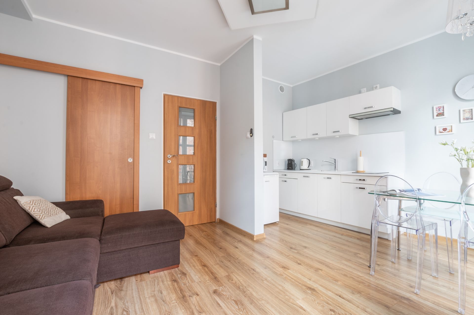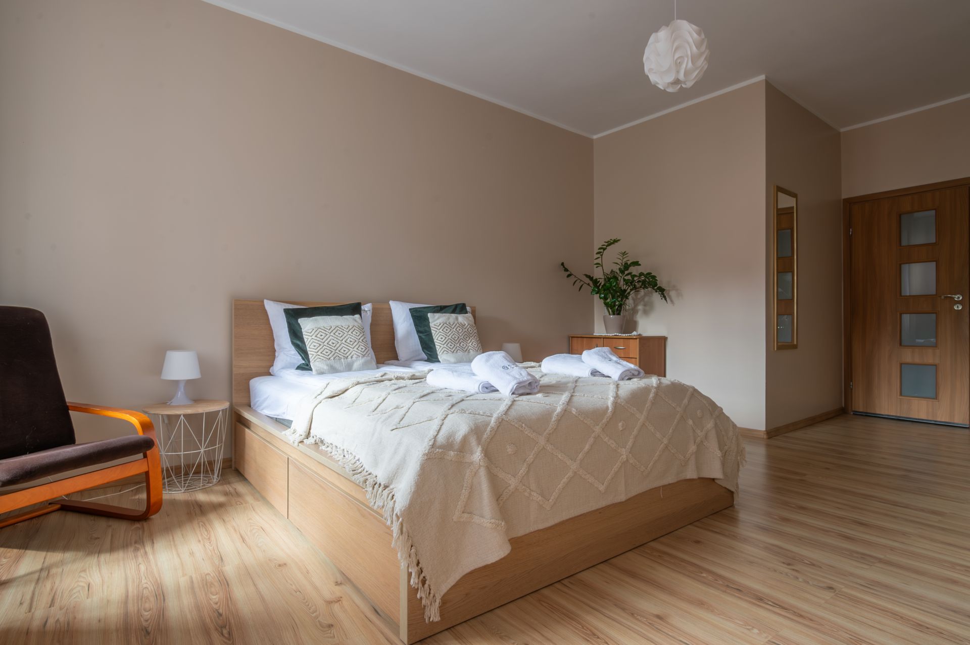 Apartament został zaprojektowany z myślą o komforcie i funkcjonalności. Oferuje przestronny salon z wygodną sofą, w pełni wyposażoną kuchnię, sypialnie z łóżkiem małżeńskim oraz łazienkę. Dzięki dużym oknom mieszkanie jest jasne i pełne naturalnego światła. Wnętrza urządzone są z dbałością o każdy detal, aby zapewnić Gościom maksymalny komfort i przytulną atmosferę.